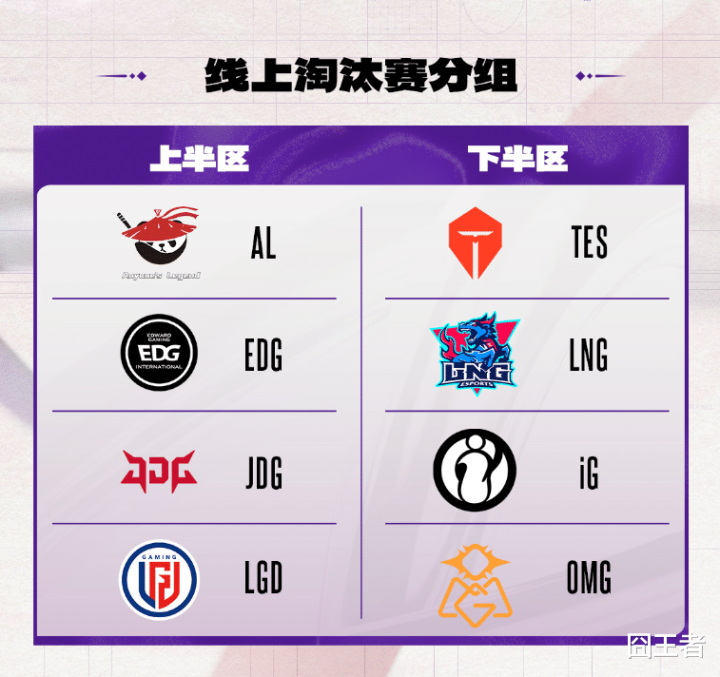 经过一周的拼杀,iG,JDG,EDG,OMG,LNG,LGD六支战队晋级。他们和种子战队TES和AL,将分为上下半区,进行线上淘汰赛。分组情况如下:上半区:AL,EDG,JDG,LGD;下半区:TES,LNG,iG,OMG。