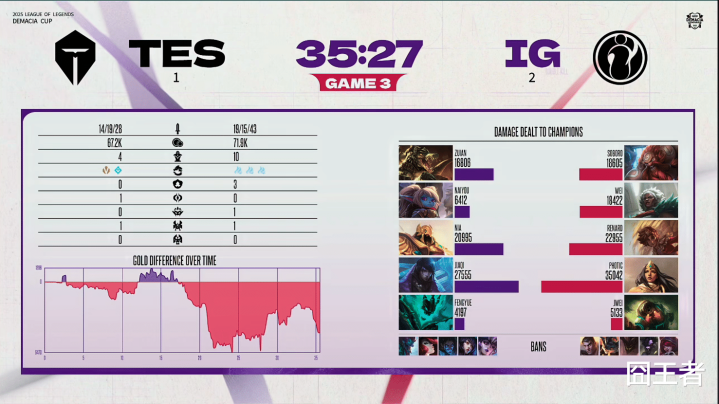 结果第三局比赛,TES完全放弃了自我,选择了IG擅长的方式自杀。17分钟左右,TES中路抱团效果不佳,Soboro酒桶丝滑操作E闪开团助IG团战取胜;20分钟左右,Wei狼母拼惩抢下厄塔汗,随后团战游龙直冲后排拿下双杀;27分钟左右,IG率先拿下大龙,但ZUIAN鳄鱼团战游龙TES完成0换3;最终35分27秒,IG团灭TES,再赢一局。